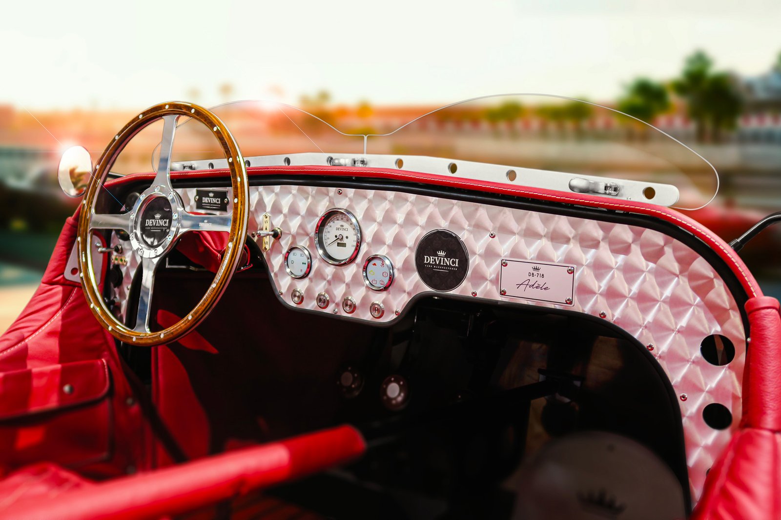 This 4-spoke steering wheel with a diameter of 15 inches (38.1 cm) made specifically for DEVINCI is made of aluminum covered with varnished wood that fits perfectly with the spirit of this vehicle and provides a very pleasant driving comfort and feel. It was also taken into account that, in the event of impact, the steering wheel could deform to avoid injuring the pilot.